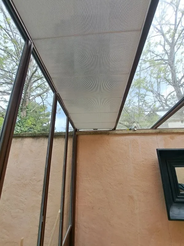 Nos clients, propriétaires d'une charmante chambre d'hôtes, ont fait construire une structure en fer forgé avec vitrage en toiture pour accueillir leurs visiteurs. Si l'esthétique était évident, la réalité thermique l'était tout autant : le vitrage créait un effet de serre important, rendant l'espace difficilement supportable aux heures les plus chaudes. Nos clients souhaitaient donc limiter la chaleur sans perdre la luminosité, et surtout, ne pas dénaturer cette architecture atypique aux formes géométriques complexes.